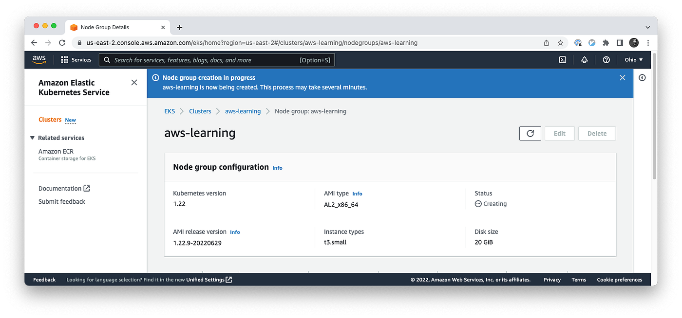 is the name of your EKS cluster. At the start of the tutorial, you picked Ohio as the region, which uses the identifier us-east-2
