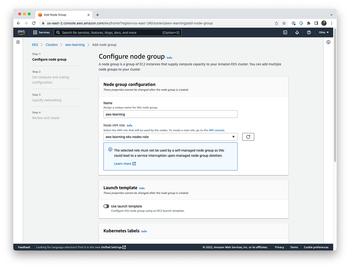 , pick the IAM role you created for worker nodes (aws-learning-eks-nodes-role